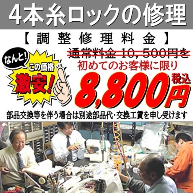 ┏★☆★☆━━━━━━━━━━━━━━━┓ あ な た の ミ シ ン の 修 理 屋 さ ん で す ┗━━━━━━━━━━━━━━━☆★☆★┛ 【 ミ シ ン 修 理 技 術 料 金 】 調整修理 ( 出張費込 ) ⇒ 9,500円 (税込) を ▼ \ 初回 お客様に限り ⇒ 7,800円 (税込) / ※注) 部品交換を伴う場合は別途申し受けます。 ※注) 分解は修理スタッフにお尋ねください。 ※注) 修理不可能な場合は料金は頂きません。 _/_/_/_/_/_/_/_/_/_/_/_/_/_/_/ 調整修理は部品交換を伴わない修理で分解や 外装カバーの取外しを行わない簡易修理です。 ご指定のご住所へ地域担当の修理スタッフが、 迅速にお伺いして親切丁寧に調整いたします。 作業時間は最短で約30分で終了いたします。 ※注) 重度の場合はお預かり修理となります。 +++★ 早くて、安くて、安心、便利です ★+++ ◎ 部品交換などが必要な場合は、お見積りを いたしますので、ご検討された上で 部品交換を行いますのでご安心ください。 ◎ オーバーホールも別途承りますので、 詳しくは修理スタッフにお尋ねください。 _/_/_/_/_/_/_/_/_/_/_/_/_/_/_/ .