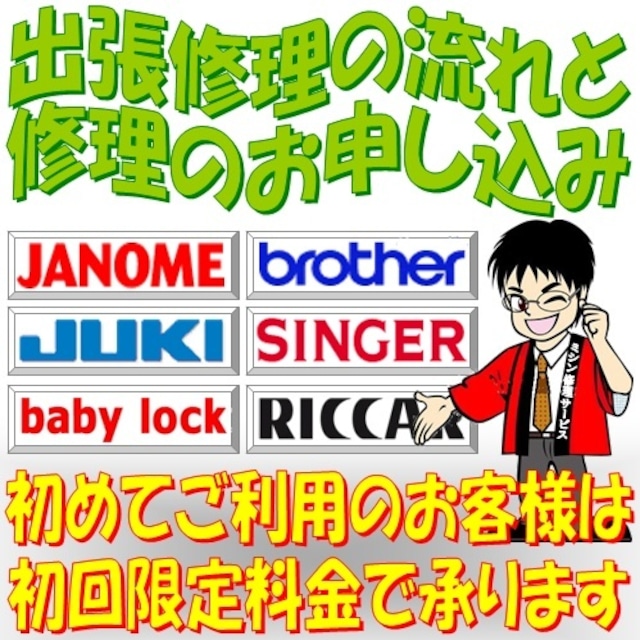 ┏★☆★☆━━━━━━━━━━━━━━━┓ あ な た の ミ シ ン の 修 理 屋 さ ん で す ┗━━━━━━━━━━━━━━━☆★☆★┛ 【 ミ シ ン 修 理 技 術 料 金 】 調整修理 ( 出張込 ) ⇒ 11,500円 (税込) を ▼ \初回お客様に限り⇒ 9,800円 (税込) / ※注) 部品交換を伴う場合は別途申し受けます。 ※注) 分解は修理スタッフにお尋ねください。 ※注) 修理不可能な場合は料金は頂きません。 _/_/_/_/_/_/_/_/_/_/_/_/_/_/_/ 調整修理は部品交換を伴わない修理で分解や 外装カバーの取外しを行わない簡易修理です。 ご指定のご住所へ地域担当の修理スタッフが、 迅速にお伺いして親切丁寧に調整いたします。 作業時間は最短で約30分で終了いたします。 ※注) 重度の場合はお預かり修理となります。 +++★ 早くて、安くて、安心、便利です ★+++ ◎ 部品交換などが必要な場合は、お見積りを いたしますので、ご検討された上で 部品交換を行いますのでご安心ください。 ◎ オーバーホールも別途承りますので、 詳しくは修理スタッフにお尋ねください。 _/_/_/_/_/_/_/_/_/_/_/_/_/_/_/ .